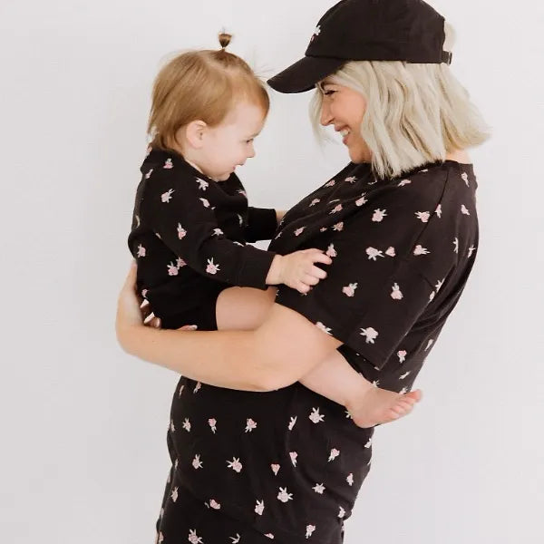 The "ROSE GARDEN" Bike Short in classic Black with an all-over vintage-inspired rose pink.
